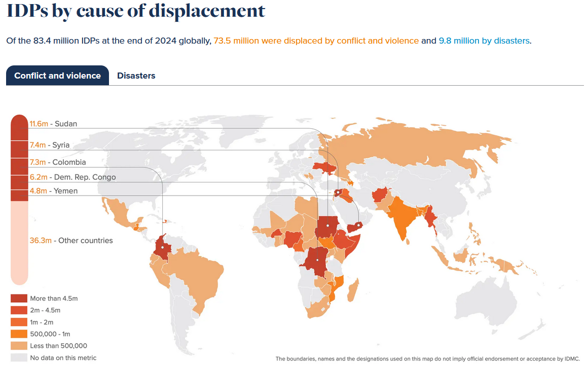 Let's not forget the problem of internal displacement. Those affected may experience similar health problems to those who have to flee to other countries. You can see more detail in the Global Report on Internal Displacement, 2025: 'The number of people living in internal displacement has more than doubled since 2018, reaching a record high of 83.4 million across 117 countries and territories at the end of 2024' Internal displacement can occur from conflict and violence, as well as from disasters, as two graphics from this report demonstrate: