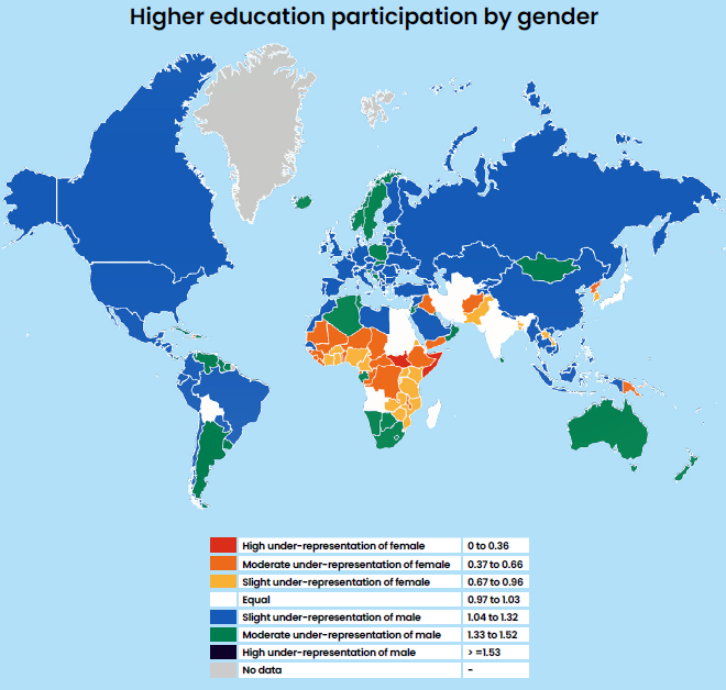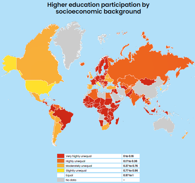 Here are two maps from the World Access to Higher Education Network showing the inequality in access by gender and socioeconomic status Drawing the Global Access Map 2: Understanding higher education inequality across the world